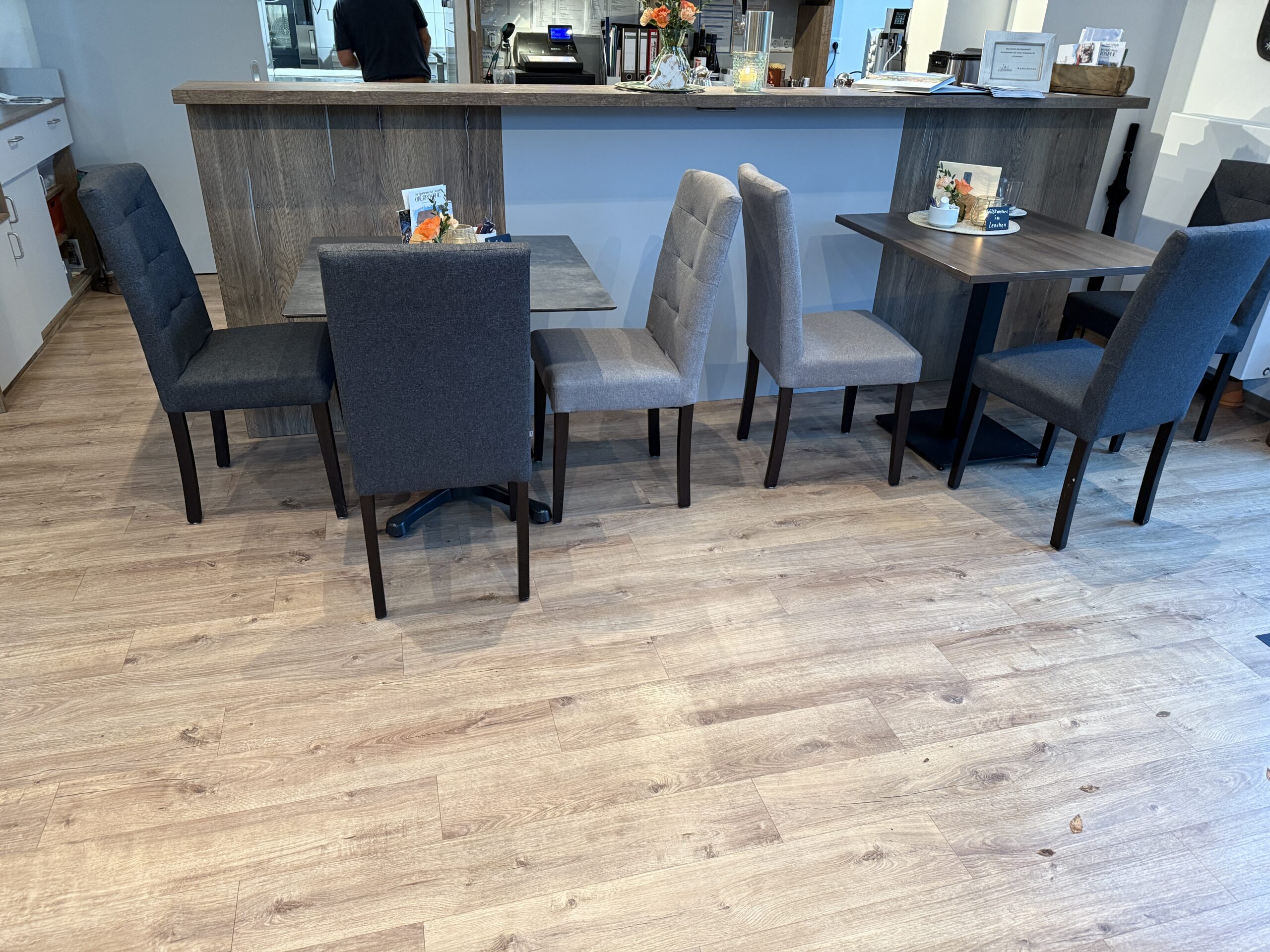 In diesem Café wurde ein hochwertiger Designboden fachgerecht verlegt, der Funktionalität und Ästhetik harmonisch verbindet. Die robuste, pflegeleichte Oberfläche eignet sich ideal für den täglichen Publikumsverkehr und schafft zugleich eine warme, einladende Atmosphäre.