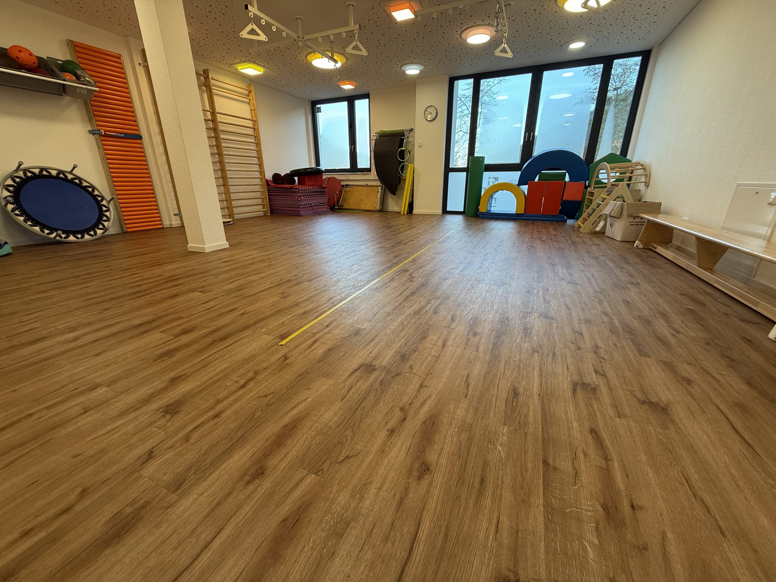 Hier wurde ein Designboden in Holzoptik verlegt. Die Oberfläche wurde mit einer Medica Hartversiegelung versehen, einer speziellen Beschichtung, die desinfektionsmittelbeständig ist, hohe Abriebfestigkeit bietet und porenfrei versiegelt und somit optimal hygienisch bleibt.