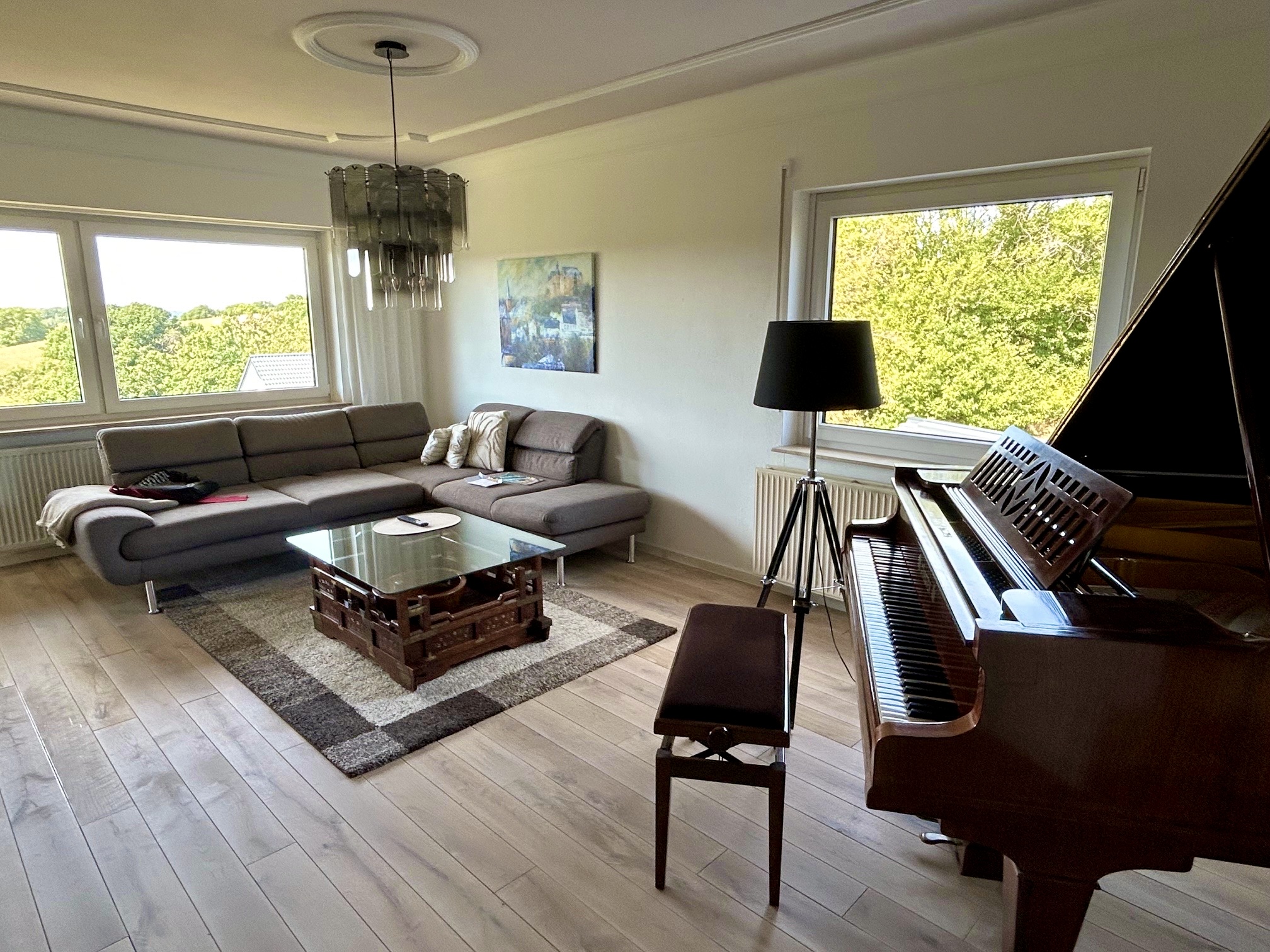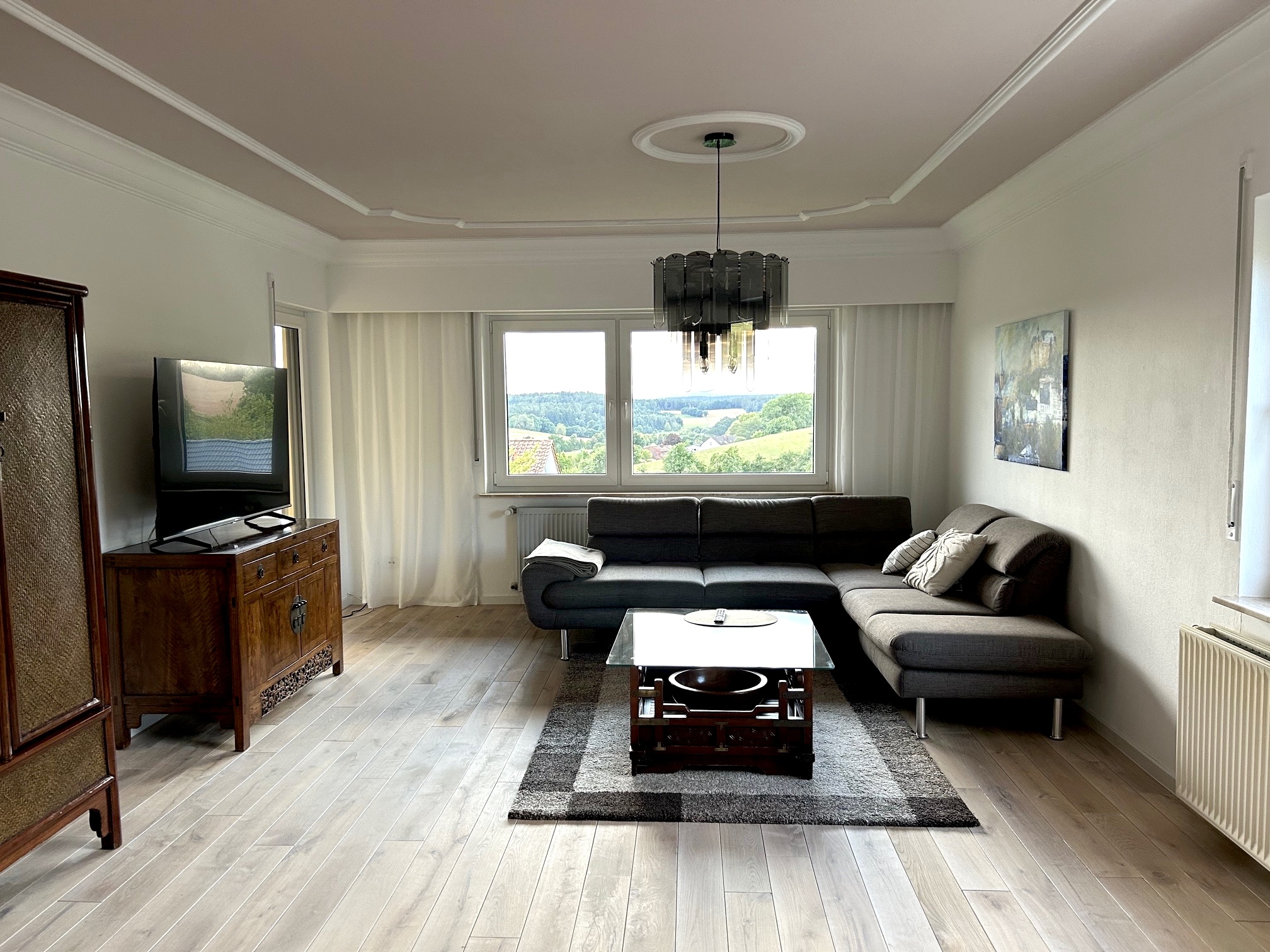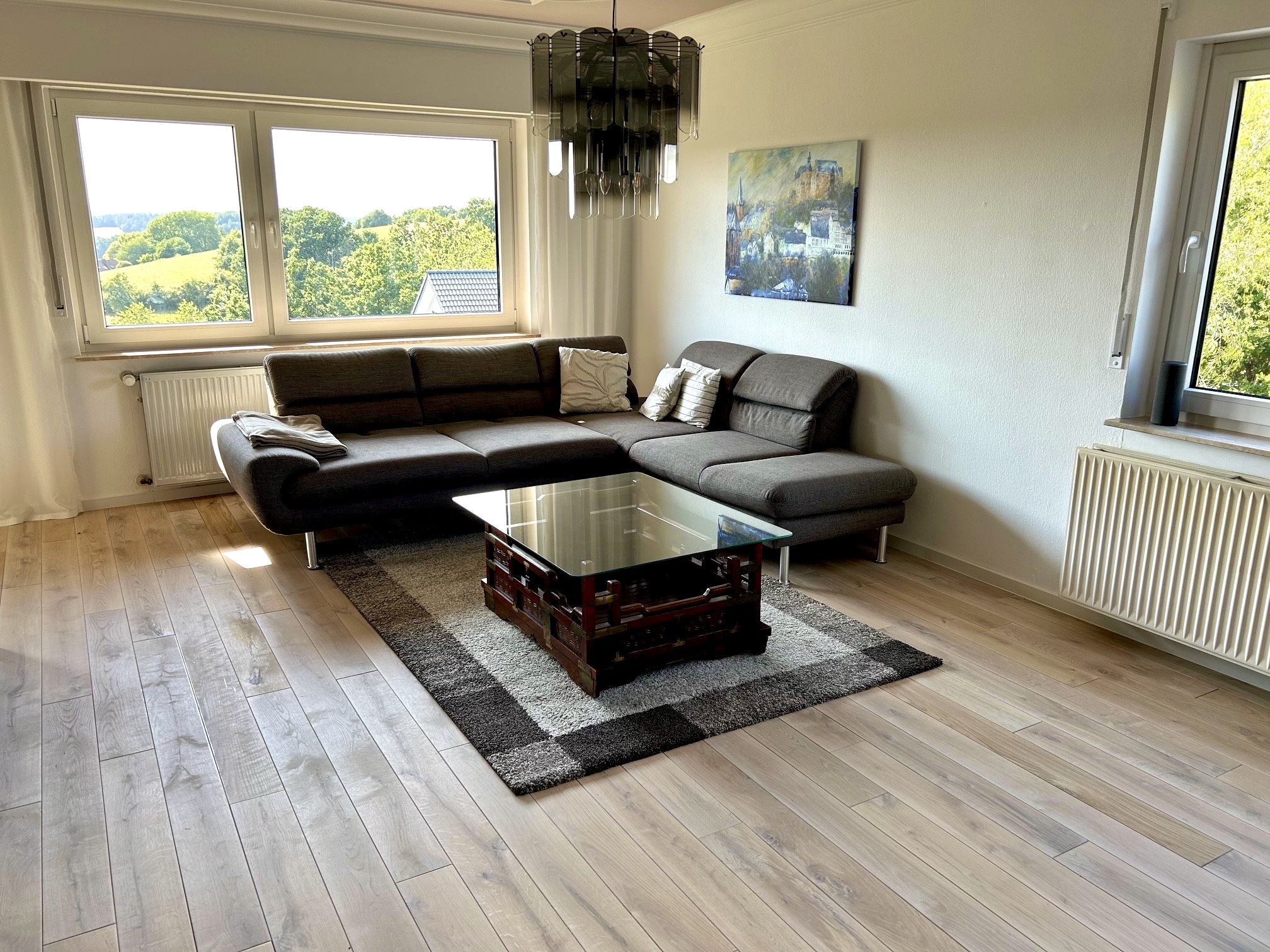 Der Massivholz-Dielenboden Eiche Markant, weiß vorgeölt, wurde fachgerecht verlegt und verleiht dem Raum eine natürliche, zeitlos elegante Atmosphäre. Die markante Sortierung betont die lebhafte Struktur des Holzes, während die weiße Vorölung für eine moderne, helle Optik sorgt und gleichzeitig das Holz schützt.