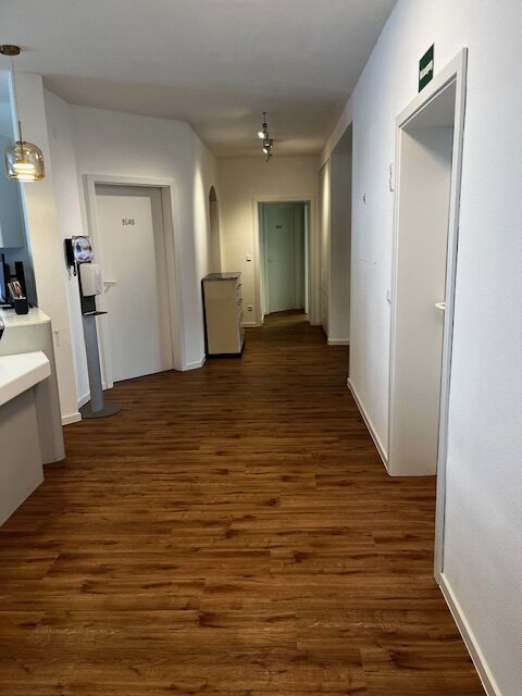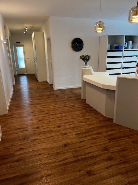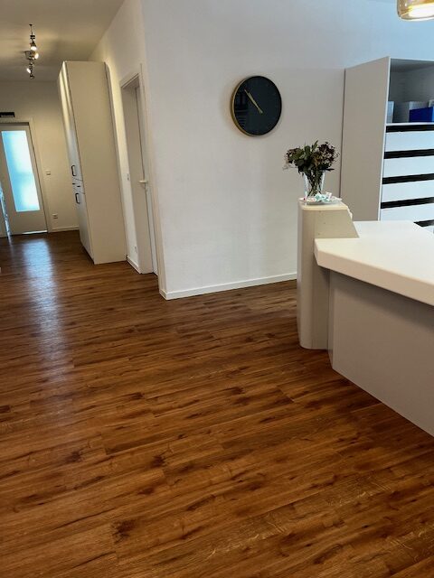 Hier wurde ein Designboden in Holzoptik verlegt. Die Oberfläche wurde mit einer Medica Hartversiegelung versehen, einer speziellen Beschichtung, die desinfektionsmittelbeständig ist, hohe Abriebfestigkeit bietet und porenfrei versiegelt und somit optimal hygienisch bleibt.
